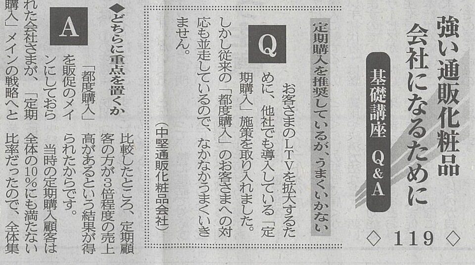『日本流通産業新聞11月13日号に、代表取締役 鯉渕の『強い通販化粧品会社になるために 基礎講座Q&A vol.119「Q. 定期購入を推進しているが、うまくいかない」が掲載されました! ------------ ...