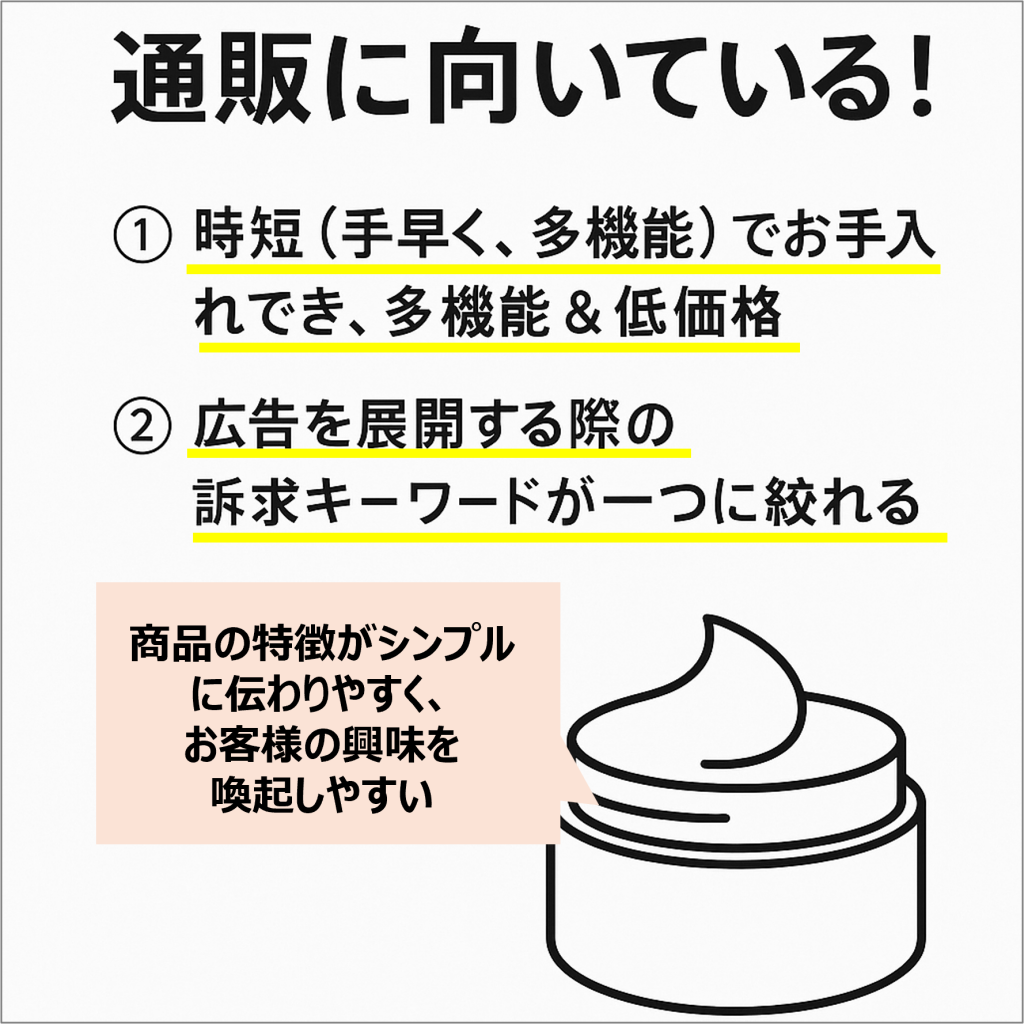 その点、オールイワン化粧品なら、「これ一つで○○○○」と消費者にとってメリットとなる訴求に絞ることができるため、キャッチコピーそのものが強くなります。その結果、商品の特徴がシンプルに伝わりやすく、お客さまの興味を喚起することができるはずです。