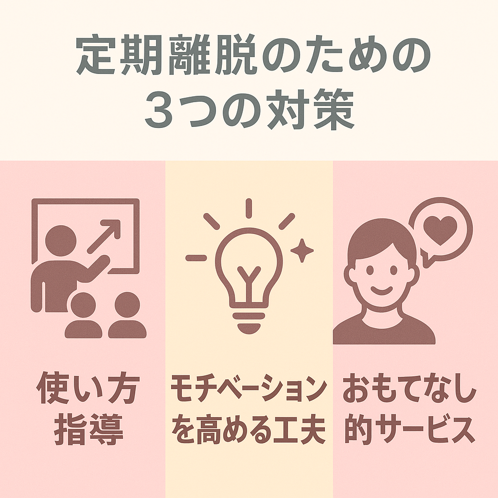 商品力やコンセプトがしっかりしている化粧品であれば、丁寧な使い方指導、お手入れのモチベーションが上がるような工夫、おもてなし的なサービス2の3点を徹底することで、定期離脱は減少するとともに、ファン化が促進されるのではないでしょうか。