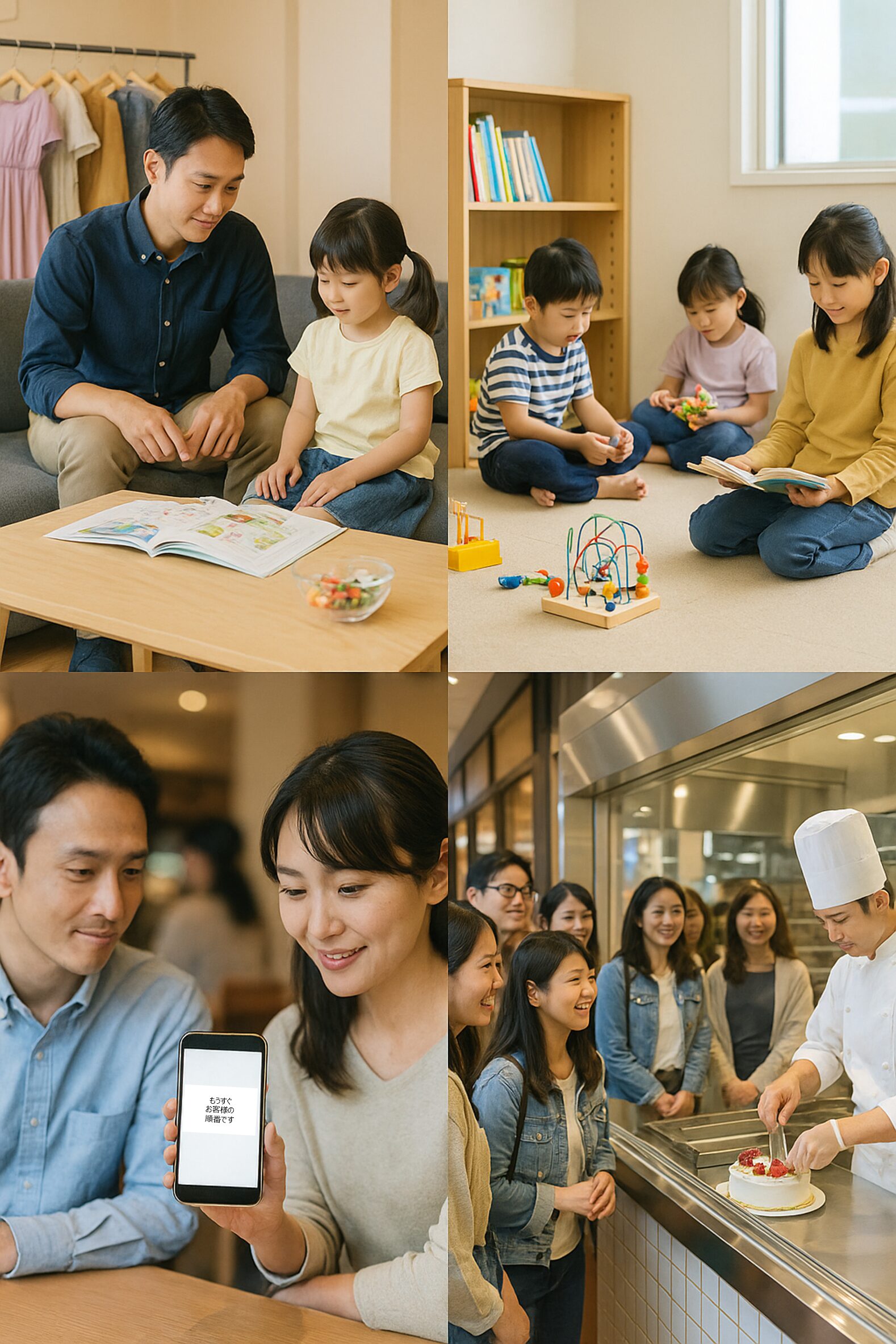 ファミリー向けのブティックでは、女性が買い物をする間、一緒に来店した夫や子どもたちが退屈しないように、ソファーとテーブルを設置し、キャンディーと一緒に折り紙や絵本、色鉛筆などを置く店があります。待合室の一角におもちゃや絵本がたくさん並べられている小児歯科も数多くあります。その場で待たなくてもいいように、順番になったら携帯に連絡してくれるレストランもあります。
