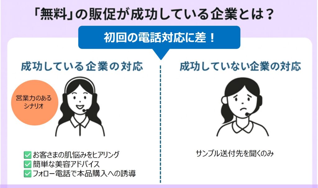 サンプル請求をした電話の時点で、お客さまの肌悩みをヒアリングし、簡単なアドバイスもしてくれます。その後、肌悩み解決のフォロー電話などで本品購入に誘導しやすいように、初回の電話からきちんとシナリオ(スクリプト)2があるように思います。そんなマンパワーと営業力を持ったコールのオペレーターをそろえた会社だったら「無料」をやる価値はあると思います。