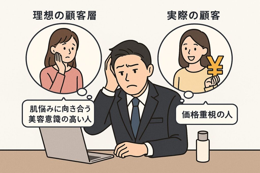 その結果、最初に設定していたお客さま像とはまったく違う、商品の価値とニーズがかけ離れたお客さまが集まってしまうということが起こります。その事例が冒頭で紹介した事例です。また、値引きを前面に打ち出した商品では、お客さまの共通項は「値引き購入」のみで、お客さまの肌悩みもライフスタイルや価値観も全くバラバラという例もあります。気が付いた時には、そんなお客さまたちの大集団になっていたという事例も少なくないわけです。