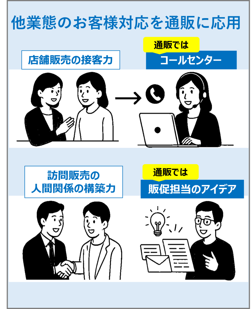 訪問販売からは、お客さまとつながりが強い販売員による人間関係の構築力。こちらは販促担当のアイデア力で補うべきです。それに加えて、通信販売ではお客さま情報をデータベースとして保有し、配送やメールリリースなどスピード感のある“機動力”があります。