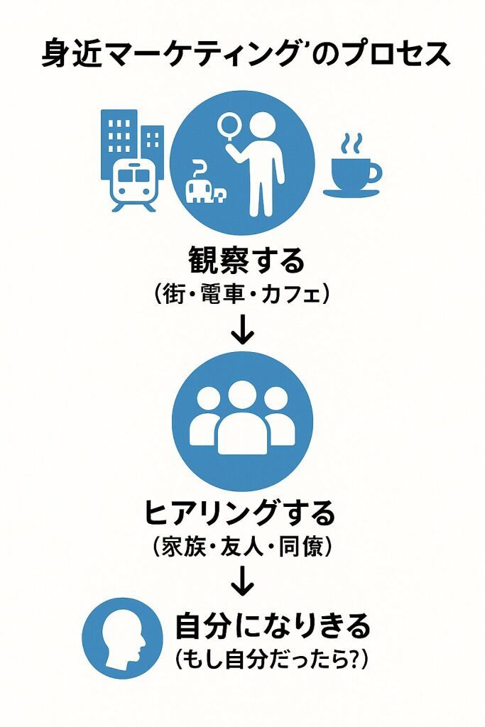 - 身近マーケティング―生活者の姿や会話を身近な日常の中で観察し、ニーズや価値観を理解する方法。街や電車での観察、家族や友人へのヒアリングなどを通じて、データやアンケートでは見えない本音をつかむアプローチです。 ↩︎