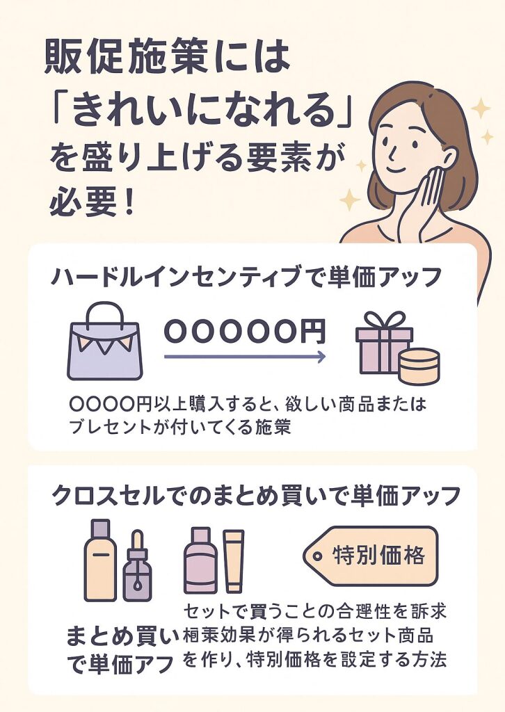 購入単価をアップするための販売施策には、お客さまが「この化粧品できれいになりたい」、しかも「今ならお得」という購入意欲を湧かせる付加価値や合理性を訴求していくことが必要になります。