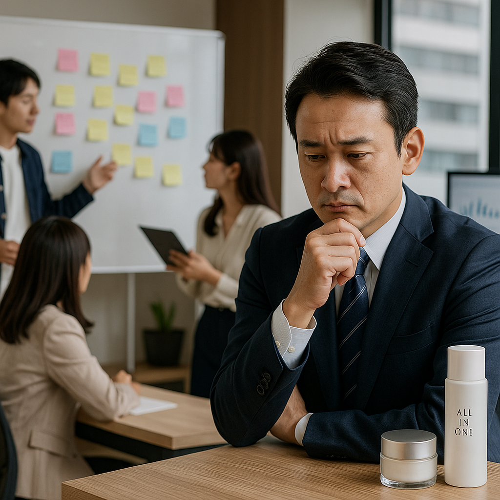 - アンチテーゼ-既存の常識や前提に対抗する、新しい発想・逆の立場の考え方。例:複雑なお手入れに対する「オールインワン化粧品」が象徴。 ↩︎