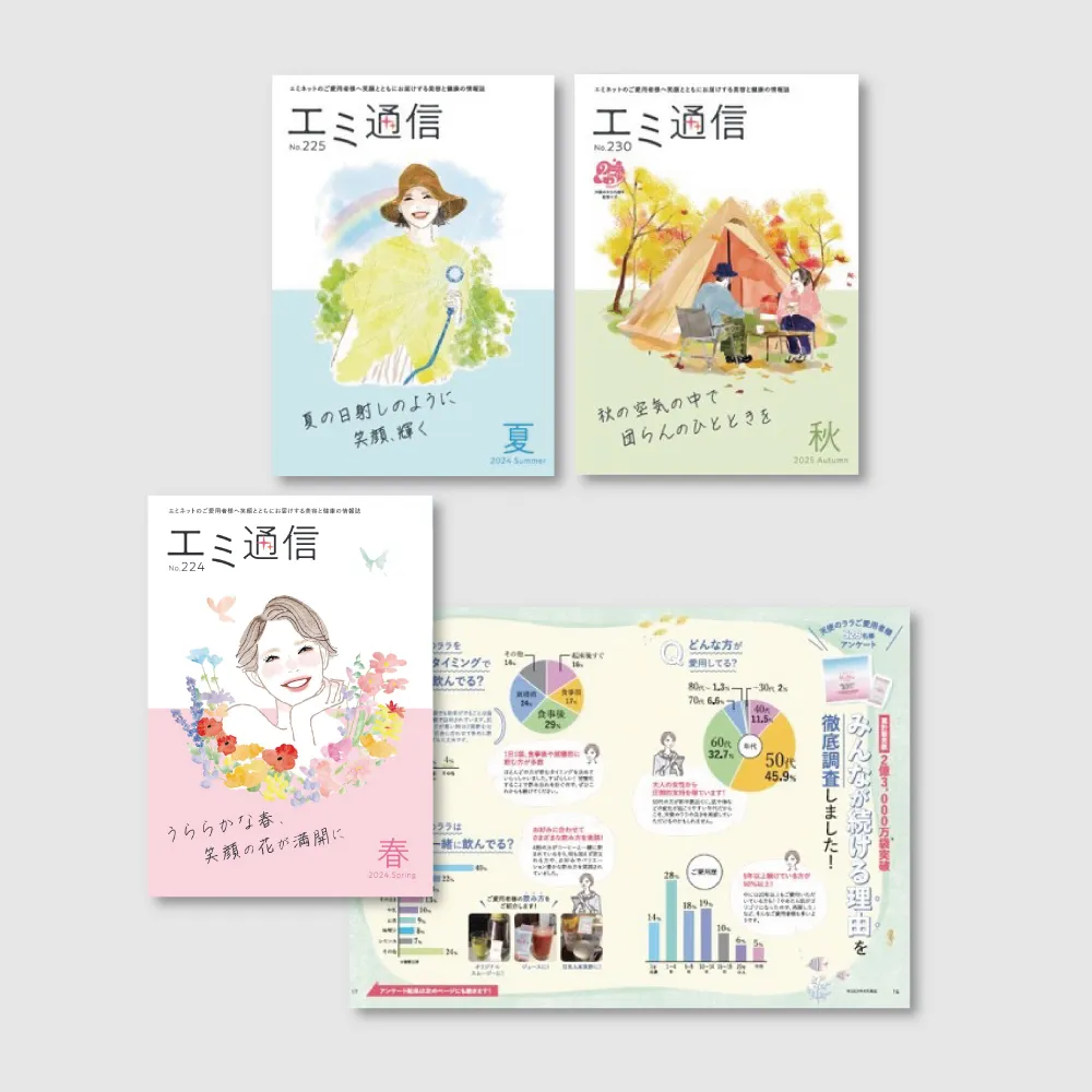株式会社エミネットご愛用者様に楽しんでいただける会報誌を制作。年代に寄り添った企画で共感と愛着を育成。