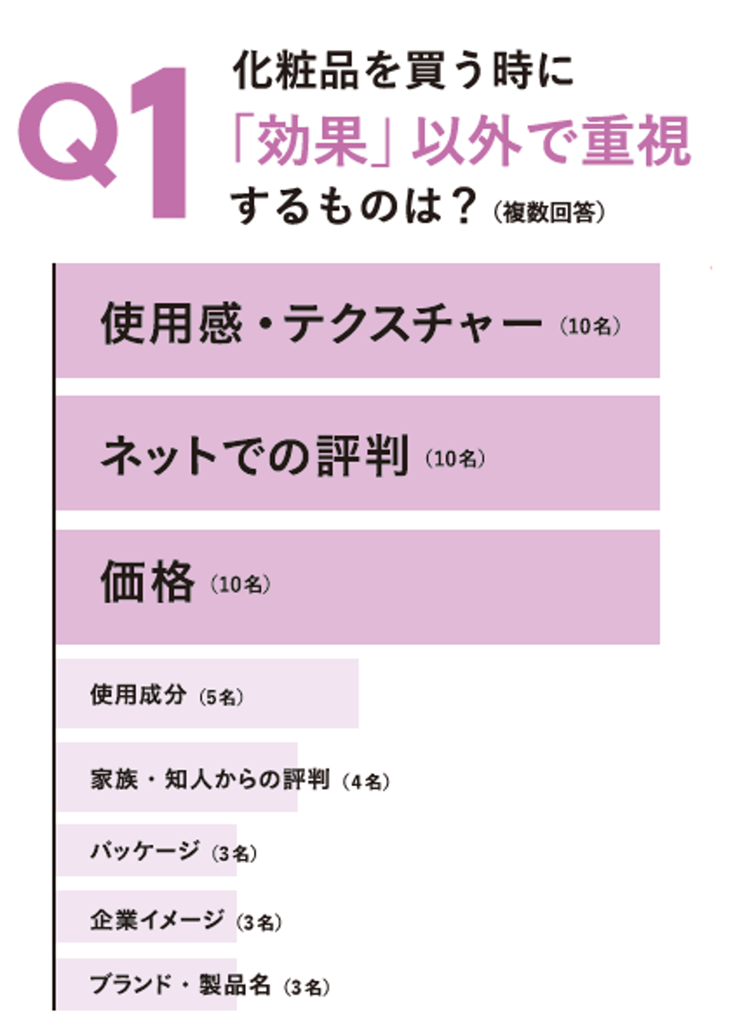 回答者の8割近くが「使用感・テクスチャー」「ネットでの評判」「価格」を選択。また半数以下ながら「使用成分」「家族・知人からの評判」を選択した人も。自分に合う成分や、身近な人の評価を重視する人もいるようです。