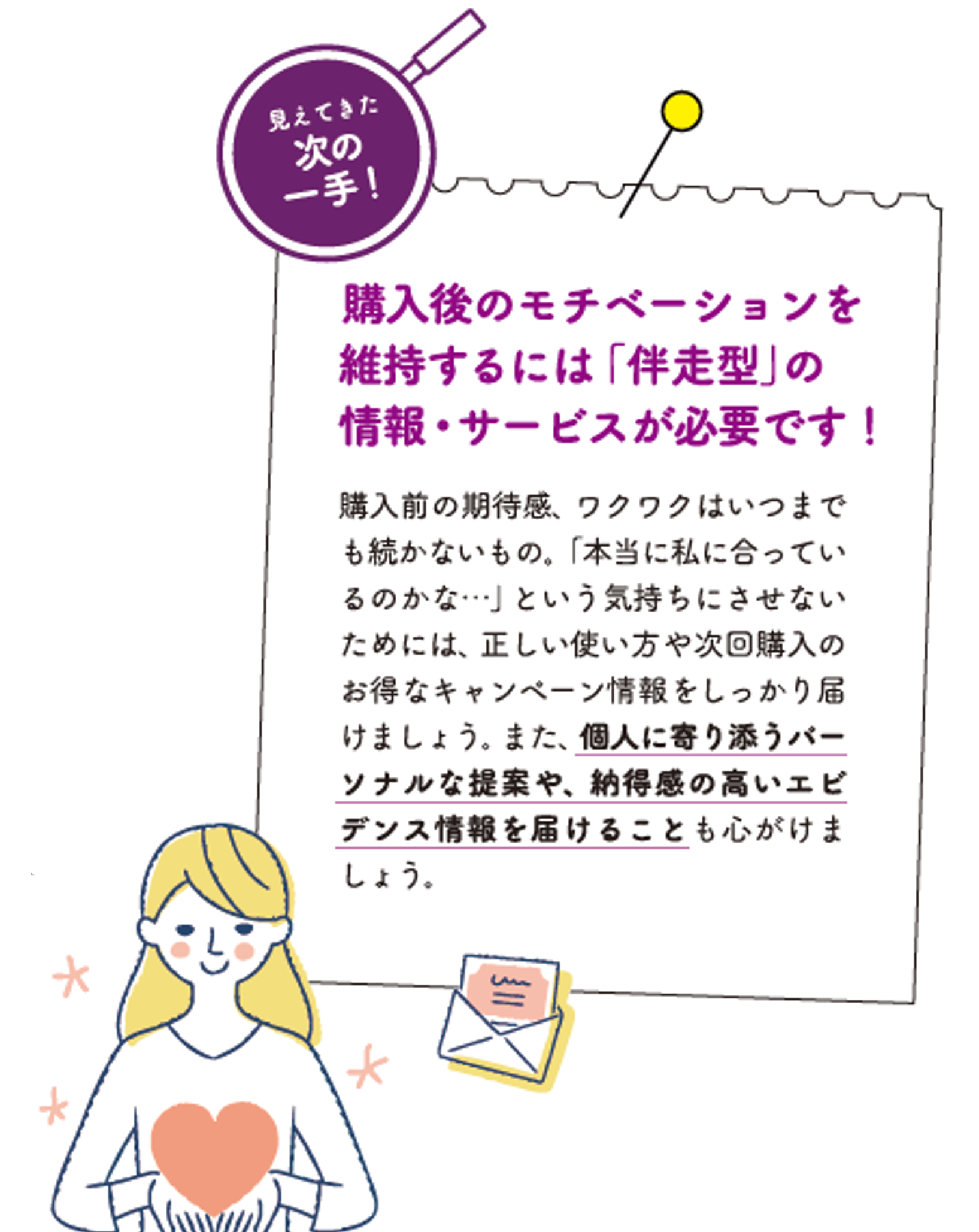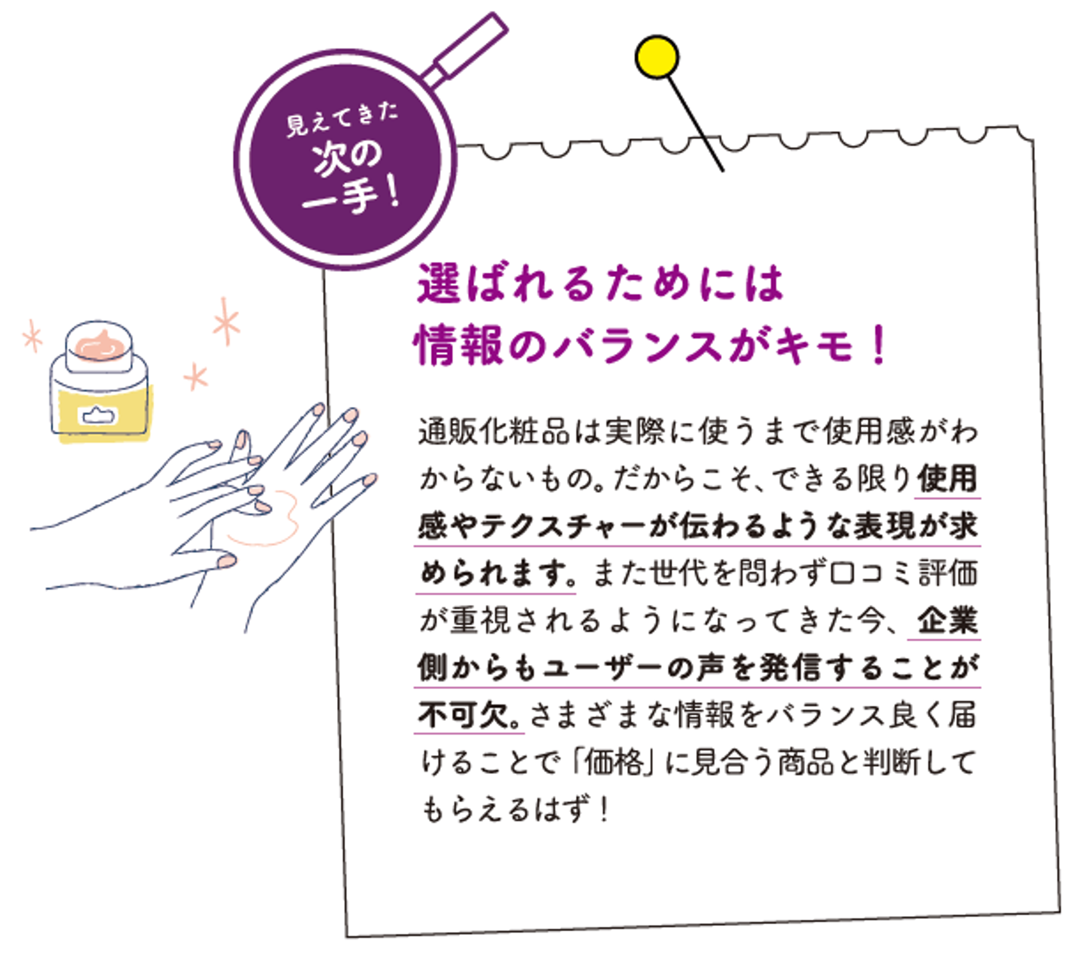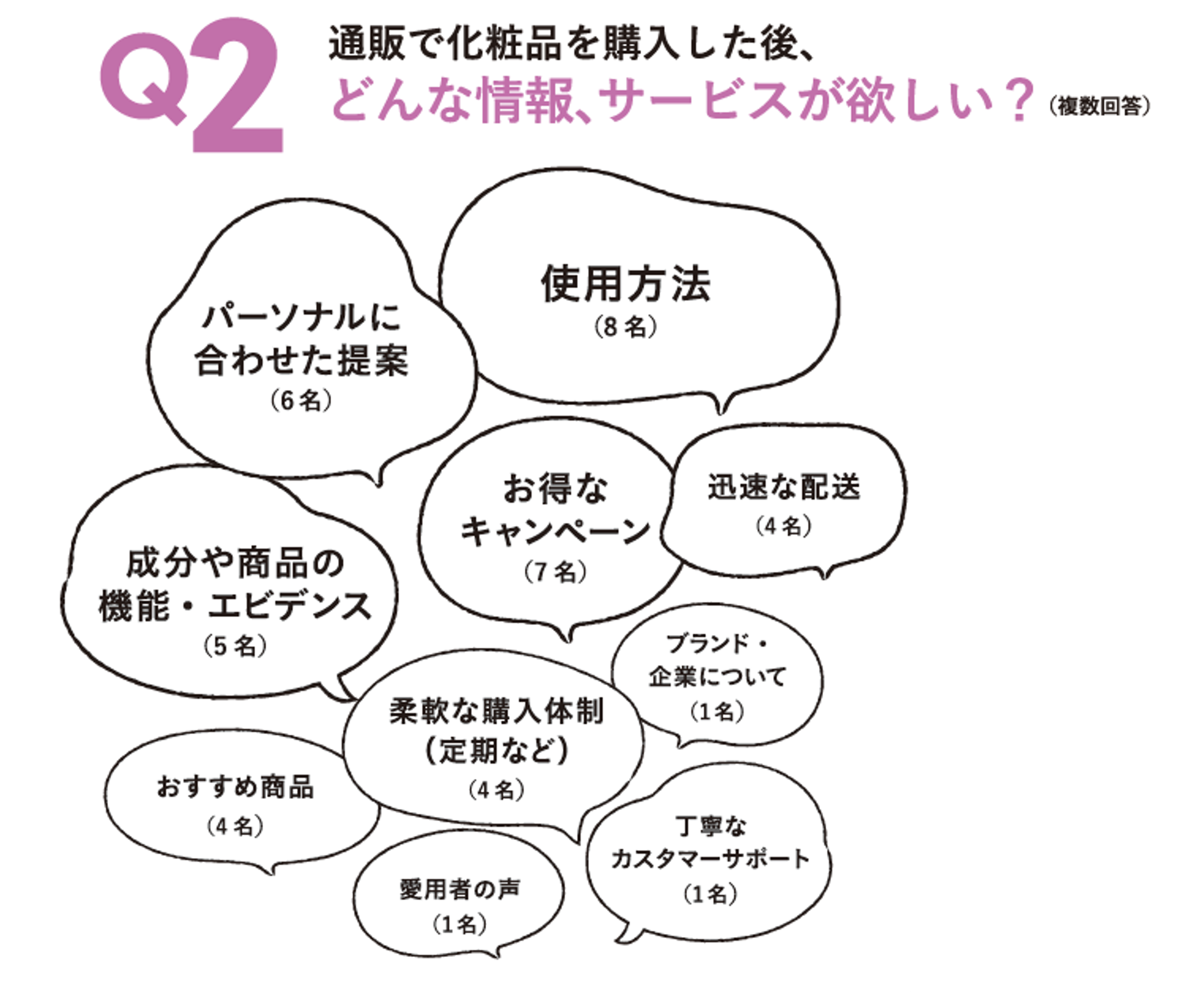 商品を使い始めてから使用方法を「おさらい」したいとの声が挙がったほか、「やっぱりお得に買いたい」との理由でキャンペーン情報を求める声も。さらに、自分の肌に合わせたパーソナルな提案が欲しいとの意見も多数聞かれました。