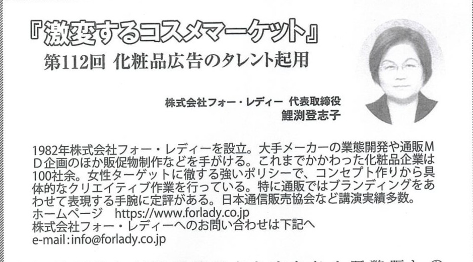 『週刊粧業新聞』10月27日号に、代表取締役 鯉渕の「激変するコスメマーケット 第112回 化粧品広告のタレント起用」が掲載されました!ぜひ、ご覧ください。 ******************************* ...