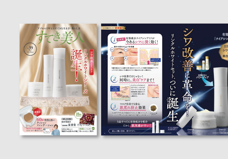 販促物は「きれい」なだけでは成果につながりません。フォー・レディーは女性ならではの感性とデータ分析を掛け合わせ、心を動かすツールを制作します。通販特有の情報誌やDMでは、「何を・誰に・どう伝えるか」を明確化し、ブランドの世界観と市場ニーズを結ぶ戦略的クリエイティブで「気になる」「試したい」「続けたい」気持ちを引き出します。