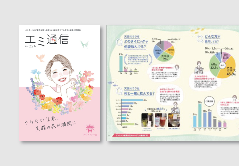 株式会社エミネットご愛用者様に楽しんでいただける会報誌を制作。年代に寄り添った企画で共感と愛着を育成。